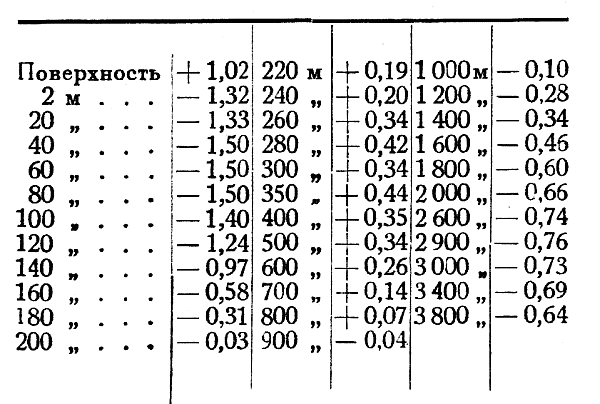 Рассматривая эту таблицу, мы видим, что до глубины 100 м температура воды остается одна и та же, около −1,5°. От 100 м она начинает подниматься, и на 200 м она достигает 0°, а на 260 м +0,34°. Температуру эту вода имеет до 500 м, после чего температура опять понижается. На 1800 м она достигает величины −0,60°, которую и сохраняет до дна.
