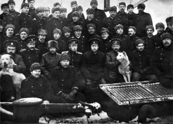 Личный состав «Вайгача» во время зимовки 1914–1915 гг. Сидят во втором ряду (за двумя матросами на переднем плане): А. Г. Никольский, Н. А. Гельшерт, П. А. Новопашенный, А. Н. Жохов, К. К. Неупокоев, Э. Е. Арнгольд