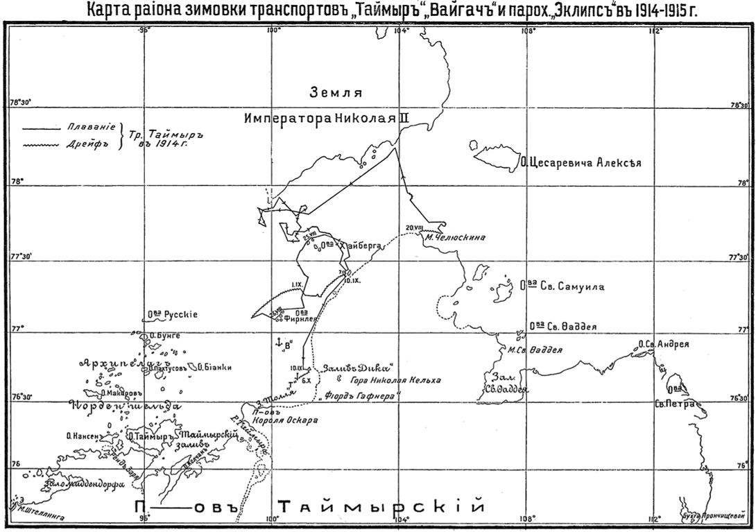 Пройдя Челюскин, встретили непроходимые льды. Оба транспорта замерзли у северного полуострова Оскара. Широта „Таймыра” около 76°40′, долгота около 100°20′, „Вайгач” западнее миль на 15. Надеемся через Свердрупа продолжать связь. В марте переведу часть офицеров и половину команды на „Эклипс”. Прошу прислать к Свердрупу для меня оленей, чтобы облегчить перевозку людей, а летом выслать к Свердрупу тонн 200 угля. Рассчитываем сберечь уголь на две или три недели навигации. Оленей хотел бы оставить около кораблей до осени. Здоровье всех вполне хорошо. Вилькицкий».