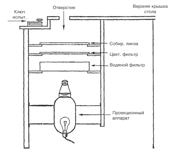 Установка для опытов была смонтирована на двух столах. На одном из них были установлены приборы для экспериментатора, за другой стол усаживался испытуемый. В крышке этого последнего было вырезано круглое отверстие диаметром около 4 см, приходившееся против ладони, лежавшей на столе руки испытуемого; на соответствующем расстоянии от отверстия помещался затопленный в крышку обычный реактивный ключ, приспособленный для подачи электрокожного раздражителя. Под крышкой этого стола помещались: вертикально установленный проекционный аппарат, лучи которого собирались, затем несколько выше водяной фильтр, далее цветной фильтр и, наконец, дополнительная линза, собиравшая лучи так, что они точно покрывали собой площадь, образуемую вырезом в верхней крышке стола. Источником света служила лампа накаливания. Электрическое раздражение давалось при помощи индукционного аппарата Дюбуа-Реймона. Включение экспериментатором света и снятие руки испытуемого с ключа отмечались электрическим «втягивающим» отметчиком, работающим совершенно бесшумно. Испытуемый был отделен от экспериментатора экраном. Во время опытов лаборатория несколько затемнялась (см. схему установки на рис. 1).