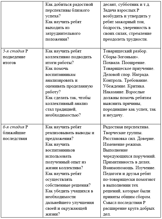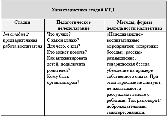 Действия воспитанников на этой стадии являются по преимуществу характерными, «показательными», в них особенно четко проявляются и положительные качества воспитанников и их слабости. Поэтому руководитель коллектива увлеченно и убежденно говорит о самом главном и нужном.