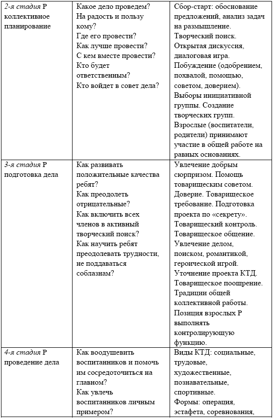 Руководитель коллектива организует использование воспитанниками накопленных при планировании, подготовке, проведении и обсуждении результатов коллективного творческого дела. Воспитатели на этой стадии решают вопросы такого характера: