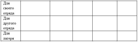 • разведка важнейших дел или серий дел на пользу и радость своему отряду, лагерю, в том числе перспективных дел, подготовка к которым будет продолжаться длительное время (например, поход-путешествие или рейд), и постоянных дел-поручений, по очереди выполняемых различными группами детей;
