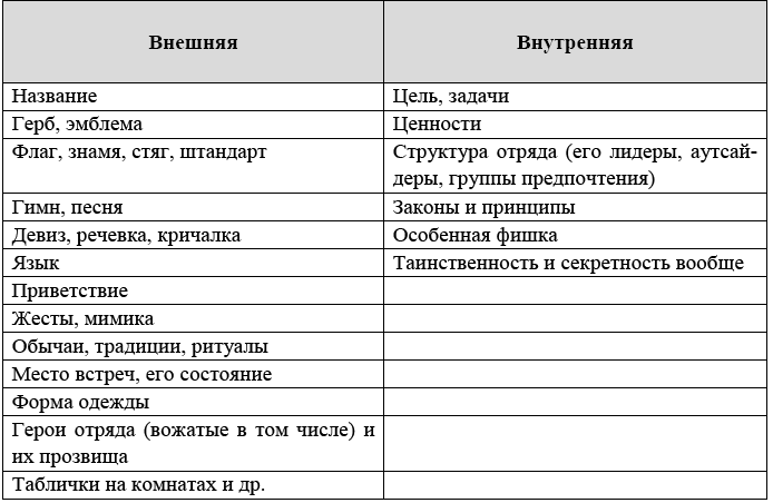 Корпоративная культура отряда может быть внешней (то, что видно другим) и внутренней (то, о чем знают лишь члены группы).