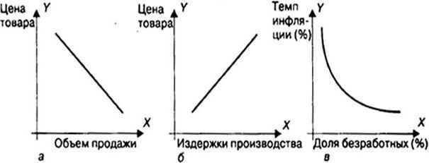 Если линия графика идет слева направо по нисходящей, то между двумя переменными существует обратная связь (так, по мере снижения цен на товар обычно растет объем его продажи – рис. 1,а). Если линия графика идет по восходящей, то связь прямая (так, по мере роста издержек производства товара обычно растут цены на него – рис. 1,6). Зависимость может быть нелинейной (т.е. изменяющейся), тогда график приобретает форму кривой линии (так, по мере уменьшения инфляции безработица имеет тенденцию к увеличению – кривая Филлипса, рис. 1.1,в).