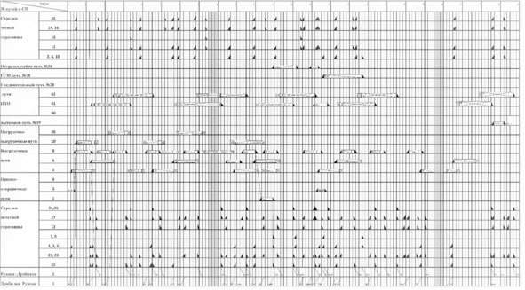 Суточный план-график – это графическое отображение процесса перемещения поездов и вагонов и выполнение с ними операций на подъездном пути. Он необходим для обеспечения бесперебойности процесса производства, ритмичности работы, непрерывности выполнения операций, наилучшего использования маневровых и технических средств, нормирования оборота вагонов на подъездном пути с расчленением по элементам и других показателей. Суточный план-график позволяет выявить загрузку всех элементов подъездного пути. Определить потребности в маневровых и технических средствах, обеспечить наименьшие задержки поездов и вагонов.