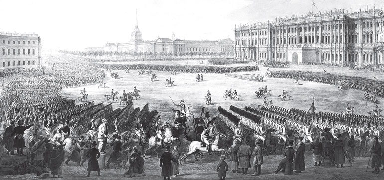 Оба великих князя, Николай и Михаил, получили бригады и тут же стали прилагать к делу вошедший в моду педантизм. В городе они ловили офицеров; за малейшее отступление от формы одежды, за надетую не по форме шляпу сажали на гауптвахту… Приятности военного звания были отравлены, служба всем нам стала делаться невыносимой. По целым дням по всему Петербургу шагали полки то на ученье, то с ученья, барабанный бой раздавался с раннего утра до поздней ночи. Манежи были переполнены, и начальники часто спорили между собой, кому из них первому владеть ими, так что принуждены были составить правильную очередь.