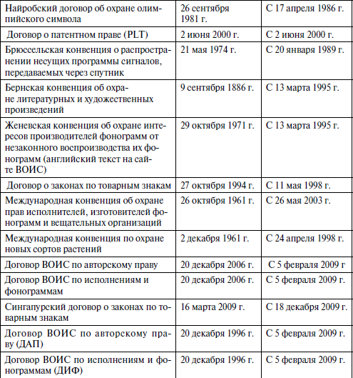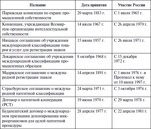 1. Российская Федерация участвует в следующих основных международных договорах в области интеллектуальной собственности: