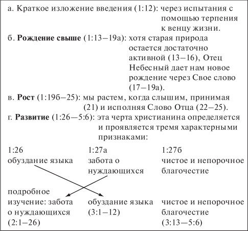 Естественно предположить, что Посланию Иакова предшествовала устная проповедь. Этим же можно объяснить зачастую резкий переход Иакова от одной темы к другой[2]. Автор с таким ярко выраженным даром проповедника, должно быть, часто слышал предложения, с которыми обращаются и к менее одаренным служителям: а что если опубликовать ваши проповеди, представить этот материал вниманию более широкого круга читателей? Не следует слишком увлекаться подобными предположениями, хотя Послание, бесспорно, выглядит как краткий конспект проповеди, в котором проповедник обозначил главные темы и некоторые детали своего обращения к верующим. Складывается впечатление, что автор ожидал вдохновения, приходящего к нему во время устных выступлений. Именно тогда он мог бы подробнее развить каждую тему и выстроить мосты между отдельными темами в проповеди. В ходе дальнейшего изучения Послания мы встретим много мест, к которым подходит это предположение. Пока же скажем следующее: подобно любой хорошей проповеди, Послание Иакова было составлено в полном соответствии с четким планом: введение, хорошо разграниченные подпункты основной части и заключение. Словно замкнув круг, заключение вернуло проповедь к началу и в то же время подвело ее итог.