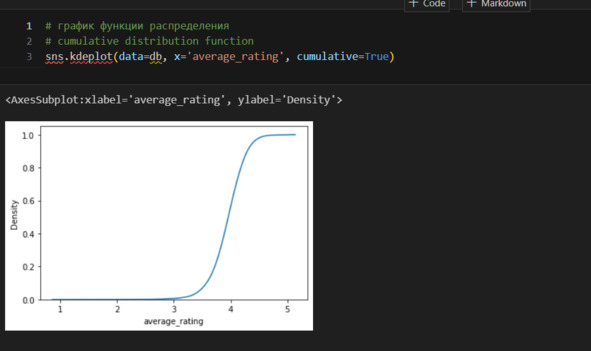Выше показан график функции распределения. Как его правильно читать? Проведу из произвольной точки на оси x перпендикуляр. Точка пересечения перпендикуляра с графиком даст значение y – вероятность того, что моя произвольная точка примет значение равное или меньшее x. Например, беру оценку 4. Вижу, что вероятность получить такую оценку между 0,5 и 0,6, примерно 55%.