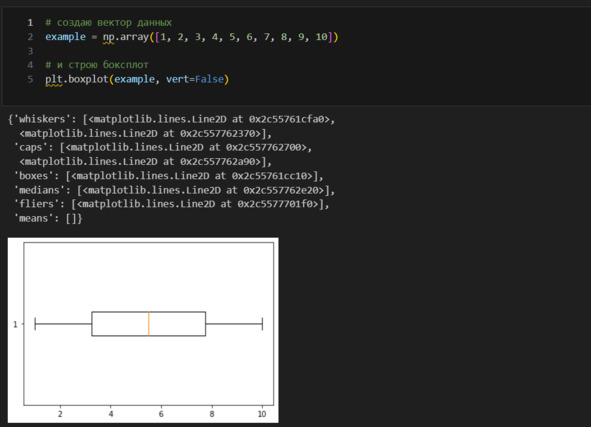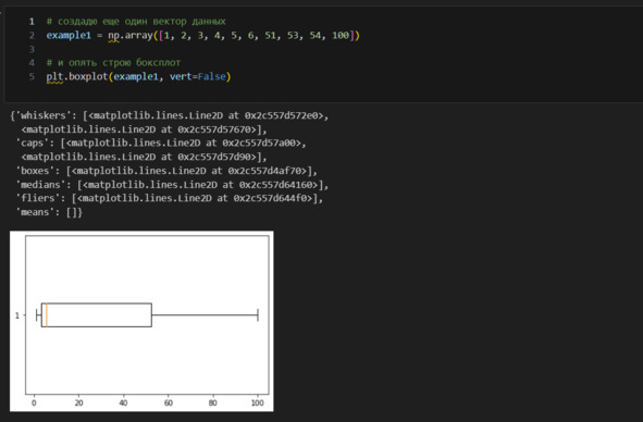 Что здесь произошло? Я создал второй вектор, где заменил 7, 8, 9, 10 на 51, 53, 54, 100. Количество значений не изменилось. Не изменилась и сама медиана – она осталась 5.5. Однако линия медианы «прижалась» к левой стороне ящика. Почему?