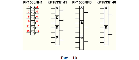 ЛИ – элементы И. Например, микросхемы: КР1533ЛИ1 (рис.1.10), содержащая 4 элемента 2И; КР1533ЛИ3 (рис.1.10), содержащая 3 элемента 3И); КР1533ЛИ6 (рис.1.10), содержащая 2 элемента 4И.