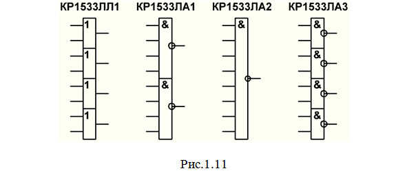 ЛА – элементы И-НЕ. Например, микросхемы: КР1533ЛА1 (рис.1.11), содержащая 2 элемента 4И-НЕ; КР1533ЛА2 (рис.1.11), содержащая 1 элемент 8И-НЕ; КР1533ЛА3 (рис.1.11), содержащая 4 элемента 2И-НЕ; КР1533ЛА4 (рис.1.12), содержащая 3 элемента 3И-НЕ.