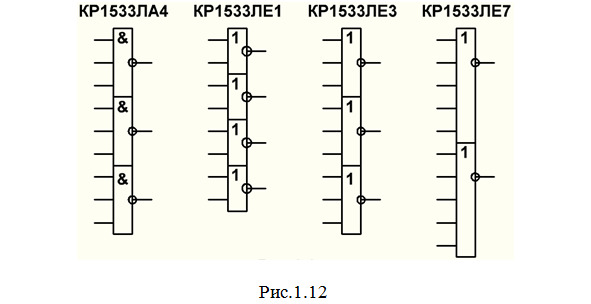 ЛЕ – элементы ИЛИ-НЕ. Например, микросхемы: КР1533ЛЕ1 (рис.1.12), содержащая 4 элемента 2ИЛИ-НЕ; КР1533ЛЕ4 (рис.1.12), содержащая 3 элемента 3ИЛИ-НЕ; КР531ЛЕ7 (рис.1.12), содержащая 2 элемента 5ИЛИ-НЕ.