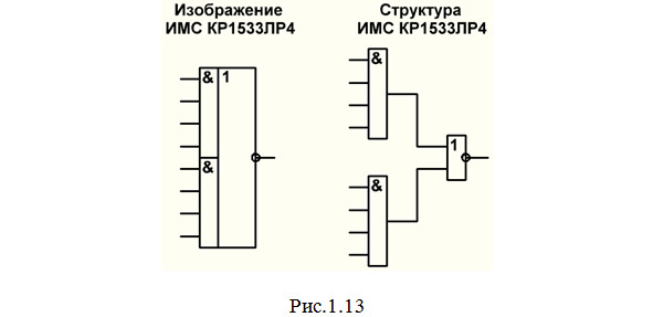 ЛР, ЛБ – комбинированные ИМС, содержащие разные логические элементы, причем обычно внутри микросхемы уже выполнены соединения между этими элементами. Например, микросхема КР1533ЛР4 (рис.1.13). Она содержит два элемента 4И и один элемент 2ИЛИ-НЕ, причем выходы элементов 4И внутри микросхемы уже соединены со входами элемента 2ИЛИ-НЕ.
