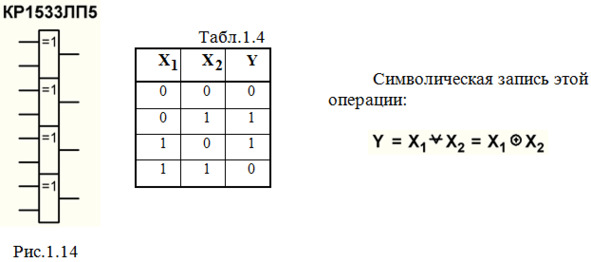 ЛП – прочие. Содержат логические элементы, не включенные в табл.1.1. Например, микросхема КР1533ЛП5 (рис.1.14) содержит элементы, выполняющие логическую операцию «исключающее ИЛИ» (в случае двух аргументов ее еще называют «неравнозначностью» или «суммой по модулю 2»), смотрите табл.1.4.
