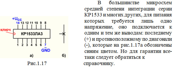 Не логические выводы часто снабжаются крестиками (рис.1.17б). К ним, в частности, относятся выводы для питания, которые обозначаются: положительный +UСС, отрицательный -GND (общий провод, от слова ground – заземление), но они на рисунках ИМС изображаются довольно редко.