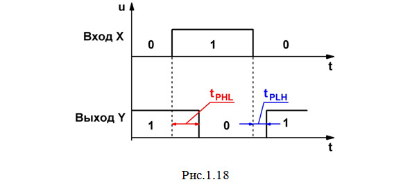 Различают время задержки распространения сигнала при включении tPHL (когда сигнал на выходе элемента меняется с 1 до 0) и при выключении tPLH (когда сигнал на выходе элемента меняется с 0 до 1). Эти величины для элемента НЕ показаны на рис.1.18.