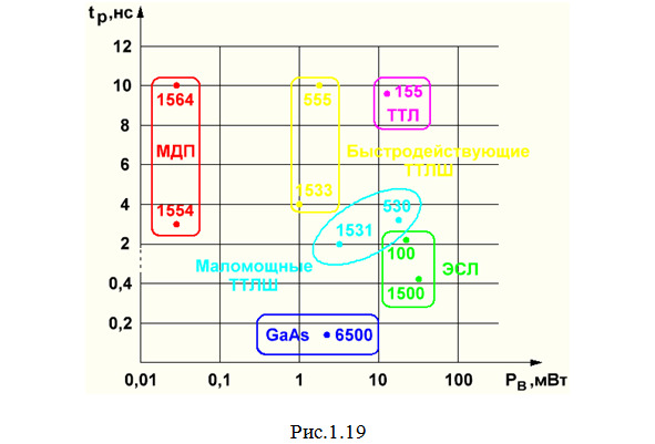 Основными параметрами, позволяющими производить сравнение по качеству микросхем различных структур и серий, являются статическая потребляемая мощность и среднее время задержки распространения сигнала в пересчете на один вентиль. Для наглядности типовые значения РВ и tP приведены на графике (рис.1.19).
