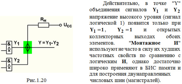 Такое соединение, позволяет реализовать логическую функцию И, поэтому называется «монтажным И» и изображается так, как показано в зеленом прямоугольнике на рис.1.20.