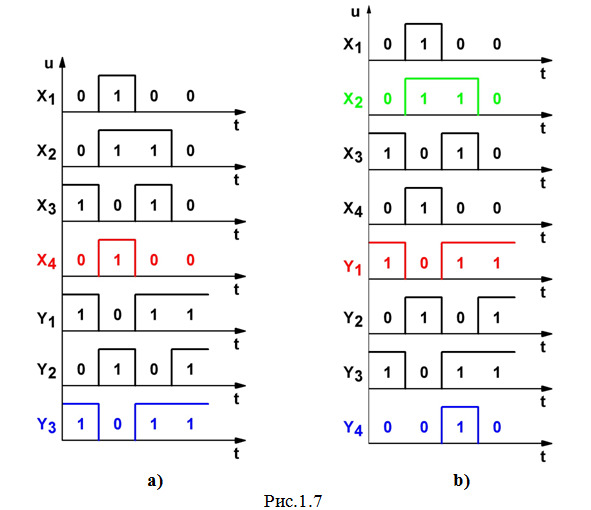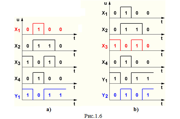 а) Сначала определим, как меняются сигналы на выходе элемента 1 (рис.1.6а). На вход этого элемента сигналы поступают со входа X1 (показано красным цветом на рис.1.6а), которые меняются следующим образом: в первом такте – 0, во втором – 1, в третьем – 0, в четвертом – 0. Элемент 1 – это элемент НЕ, который инвертирует данные поступающие сигналы и на своем выходе Y1 формирует последовательность 1011 (на рис.1.6а показано синим цветом).