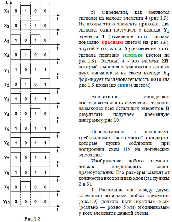 б) Теперь рассмотрим изменение сигналов на выходе элемента 2 (рис.1.6b). На оба входа этого элемента поступают сигналы со входа X3 (показано красным цветом на рис.1.6b), которые меняются так: в первом такте – 11, во втором – 00, в третьем – 11, в четвертом – 00. Элемент 2 – это элемент 2И-НЕ, который выполняет умножение данных поступающих сигналов с последующим инвертированием полученных результатов и на своем выходе Y2 формирует последовательность 0101 (на рис.1.6b показано синим цветом).