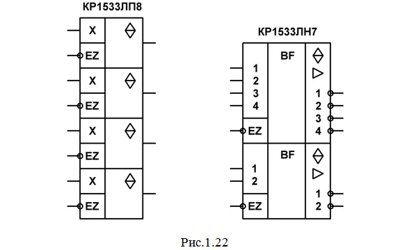 В некоторых случаях вход EZ делается общим для нескольких элементов. Например, в микросхеме КР1533ЛН7 (рис.1.22) содержится шесть буферных элементов НЕ с тремя состояниями выходов и повышенной нагрузочной способностью, разделенных на две группы по 4 и 2 элемента. Каждая группа элементов имеет свой управляющий состояниями вход EZ. Подача сигнала 1 на такой вход переводит в Z-состояние сразу все элементы соответствующей группы.