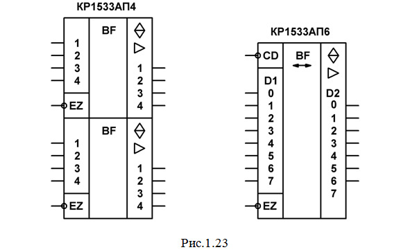 У таких ИМС в третьей части маркировки обычно ставят буквы АП, хотя иногда используется маркировка ЛП или ЛН (как, например, в только что рассмотренной микросхеме). Условное графическое изображение формирователей имеет, как правило, буквы BF (от английского buffer – буфер). Применяются они обычно в микропроцессорных системах и системах обработки данных с магистральной организацией обмена информацией.
