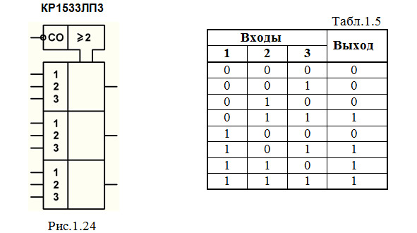 В качестве примера можно рассмотреть микросхему КР1533ЛП3 (рис.1.24). Она содержит три мажоритарных элемента «два из трех» (т.е. на выходе формируется такой сигнал, который действует не менее чем на двух входах из трех), работа каждого из них описывается таблицей истинности (табл.1.5).