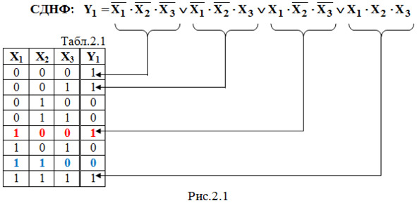 Предположим, задана таблица истинности (табл.2.1 на рис.2.1), описывающая работу ЦУ, которое имеет три входа Х1, Х2, Х3 и один выход Y1.