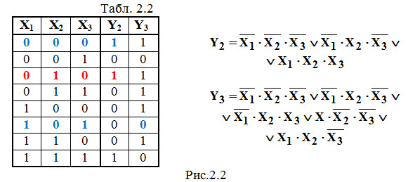 Приведем еще два примера составления СДНФ для логических функций Y2 и Y3, заданных в табл.2.2 на рис.2.2.