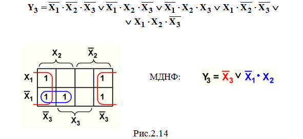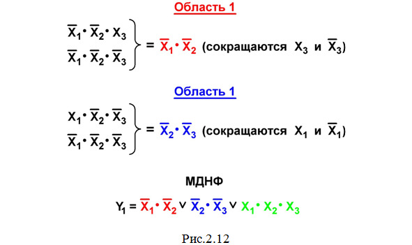 В результате на этом же рис.2.12 записываем МДНФ (красным, синим и зеленым цветом показаны минтермы, которые получились в результате «склеивания» клеток в областях объединения соответствующего цвета на рис.2.11).