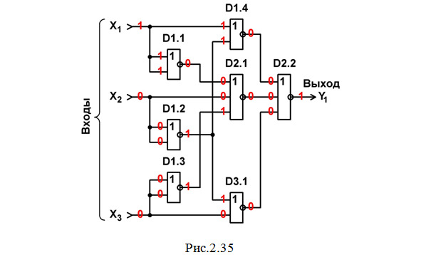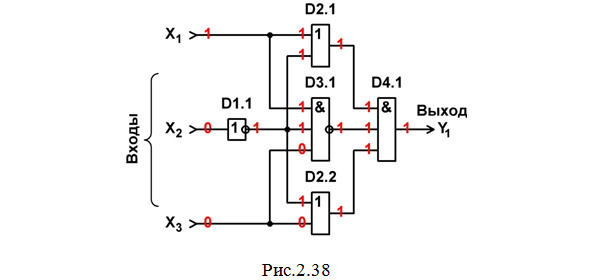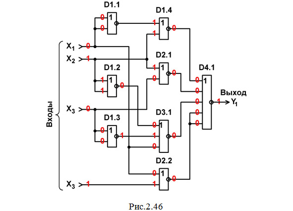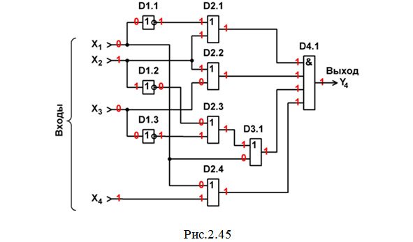18. Строим схему ЦУ в базисе И, ИЛИ, НЕ (рис. 2.45) и выполняем анализ ее работы в статическом режиме для одной комбинации входных сигналов (см. красную строку в табл. 2.18).