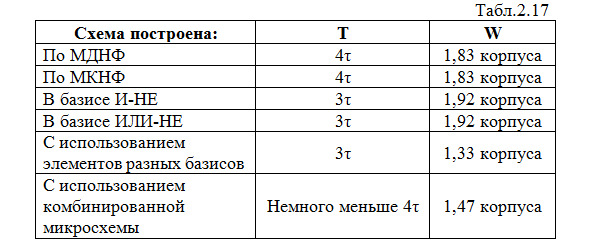 Для примера проведем сравнительную оценку качества схем, реализующих функцию Y1, которые были построены нами различными способами. Для этого сведем данные по T и W в небольшую таблицу (табл. 2.17).