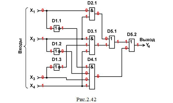 5. Строим схему ЦУ в базисе И, ИЛИ, НЕ (рис. 2.42) и выполняем анализ ее работы в статическом режиме для одной комбинации входных сигналов (см. красную строку в табл. 2.18).