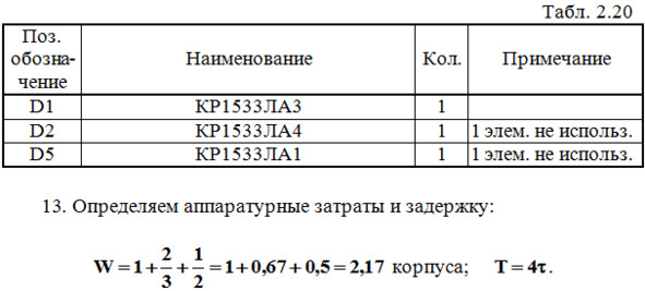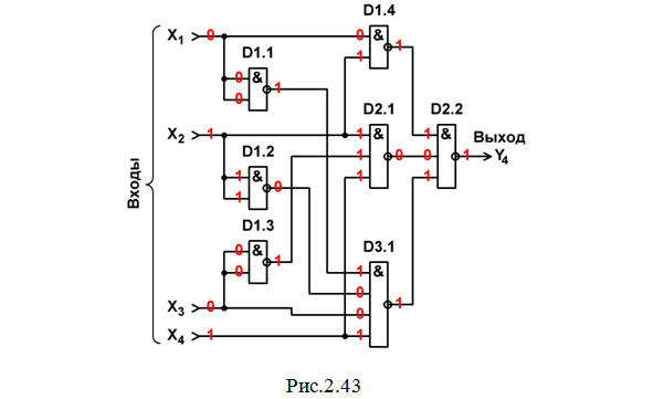 11. Строим схему ЦУ в базисе И-НЕ (рис. 2.43) и выполняем анализ ее работы в статическом режиме для одной комбинации входных сигналов та (см. красную строку в табл. 2.18).