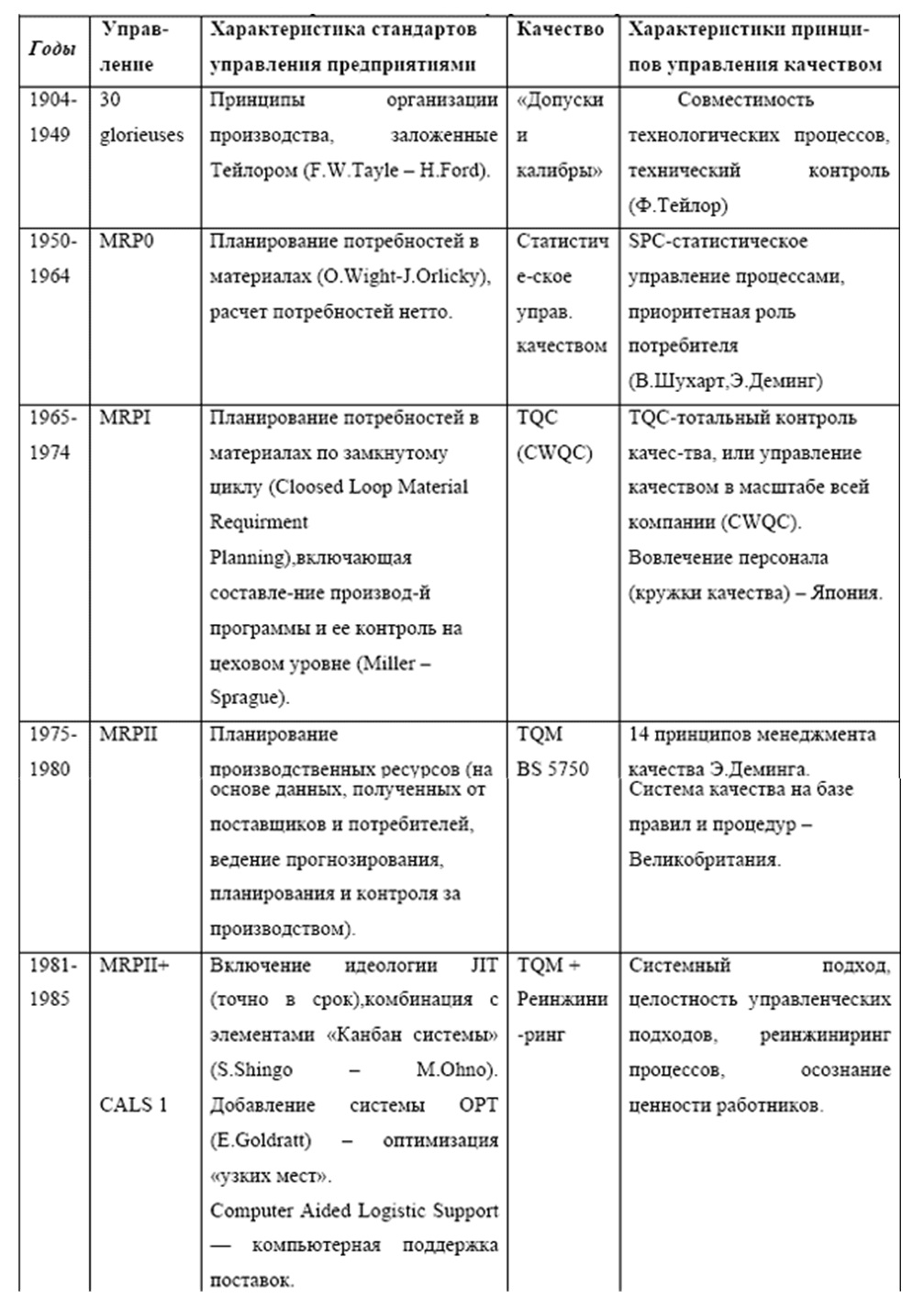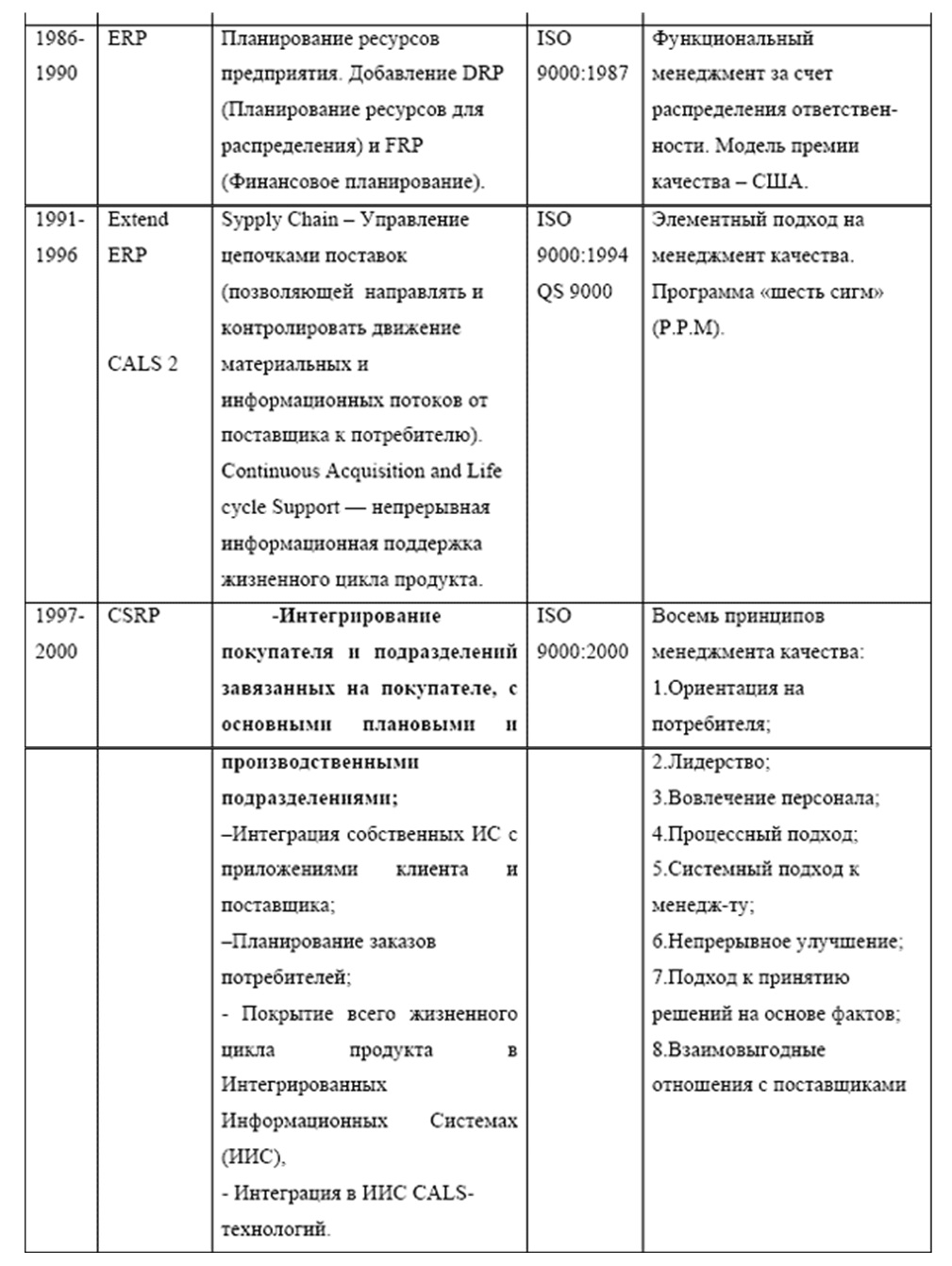 Как видно из Таблицы источником развития ERP-стандартов и Стандартов Качества является «Научная организация труда» Ф. Тейлора. С развитием Вычислительной Техники (ВТ) произошло разделение на Систему Управления производством (которая опиралась на автоматизированную поддержку) и на Систему управления качеством (которая, помня заветы Э.Деминга, больше опиралась на бумажные процедуры и производственные философии). CALS-идеология, появившаяся в середине 80 гг. прошлого века, протянула мостик между «Автоматизированными Системами Управления(АСУ) и Проектирования(САПР)» и «Системой качества (СК)», вводя стандарты управления как структурированными документами (характерными для АСУ), так и неструктурированными документами (характерными для СК). С конца 80 гг. развитие АСУ было направлено в сторону Интегрированной Информационной Системы (ИИС), впитывающей в себя как CALS-технологии, так и методологии Системы Качества. Фундаментом такой интеграции стало: