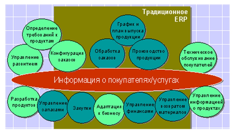 CSRP устанавливает методологию ведения бизнеса, основанную на текущей информации о покупателе. CSRP сдвигает фокус предприятия с планирования от потребностей производства к планированию от заказов покупателей. Информация о покупателях и услуги вплавляются в основу организации (смотри рисунок 1.1.11).