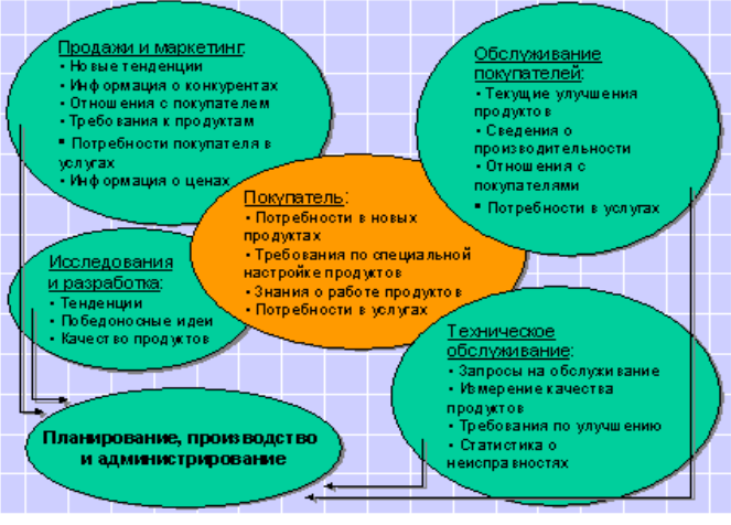 Ответ в том, что производители решительно принимают решения по выбору продуктов и рынка; но эти решения, и лица их принимающие изолированы от исполнительных подразделений организаций. Критическая информация о покупателе и знание рынка удалены из основной системы планирования бизнеса и изолированы в различных местах, разбросанных по организации. Не существует конкретного и действенного способа проводить знания о покупателе через организацию. Как показано на рисунке 1.1.10 покупательская информация существует в подразделениях из четырех основных функциональных областей: Продажа и Маркетинг, Обслуживание покупателей, Техническое обслуживание, Исследование и разработка.