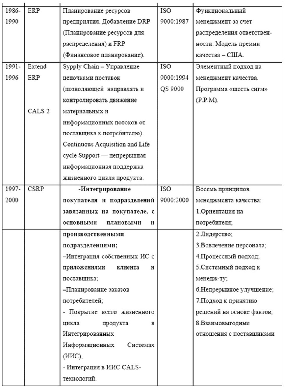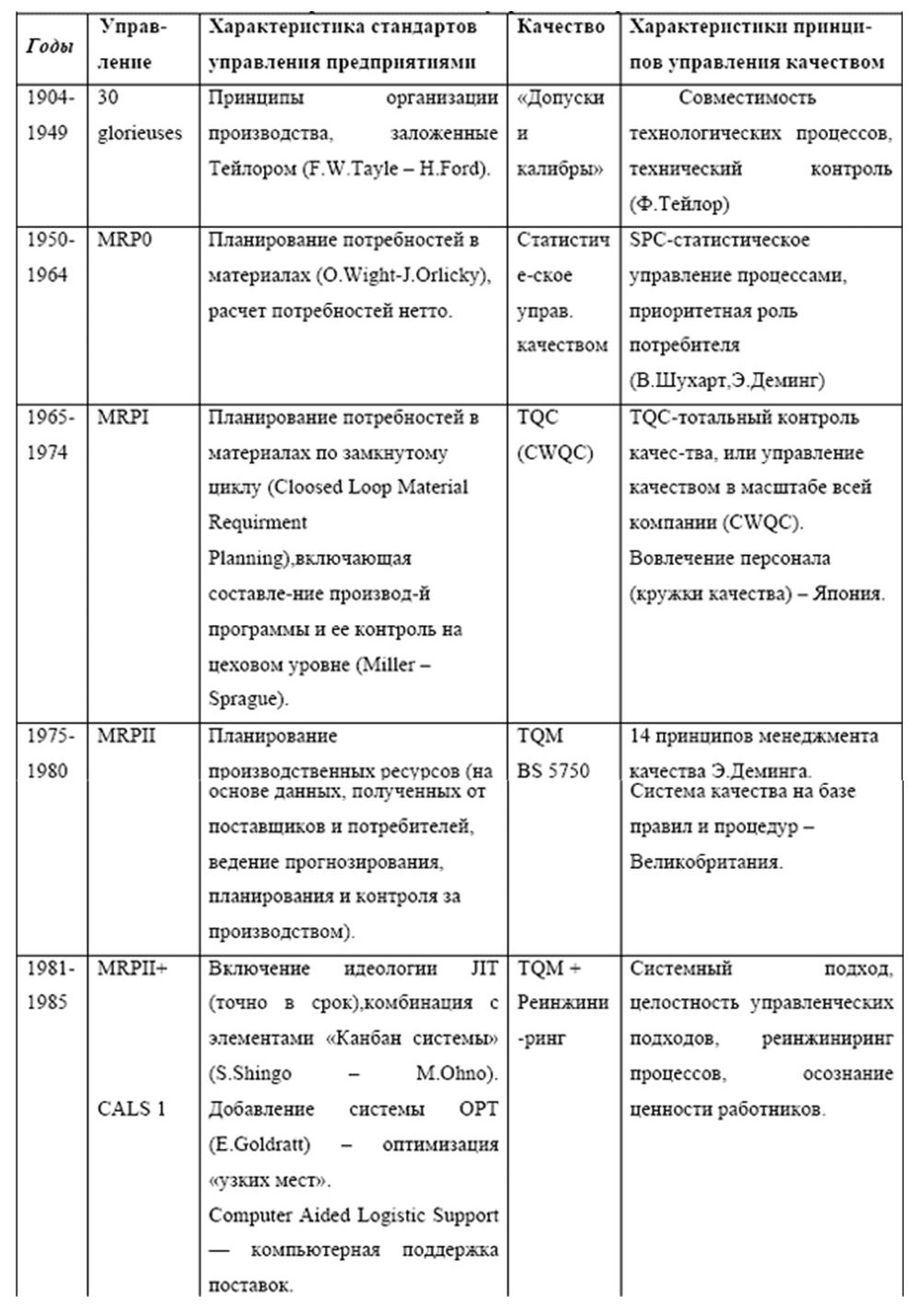 Как видно из Таблицы источником развития ERP-стандартов и Стандартов Качества является «Научная организация труда» Ф. Тейлора. С развитием Вычислительной Техники (ВТ) произошло разделение на Систему Управления производством (которая опиралась на автоматизированную поддержку) и на Систему управления качеством (которая, помня заветы Э.Деминга, больше опиралась на бумажные процедуры и производственные философии). CALS-идеология, появившаяся в середине 80 гг. прошлого века, протянула мостик между «Автоматизированными Системами Управления(АСУ) и Проектирования(САПР)» и «Системой качества (СК)», вводя стандарты управления как структурированными документами (характерными для АСУ), так и неструктурированными документами (характерными для СК). С конца 80 гг. развитие АСУ было направлено в сторону Интегрированной Информационной Системы (ИИС), впитывающей в себя как CALS-технологии, так и методологии Системы Качества. Фундаментом такой интеграции стало:
