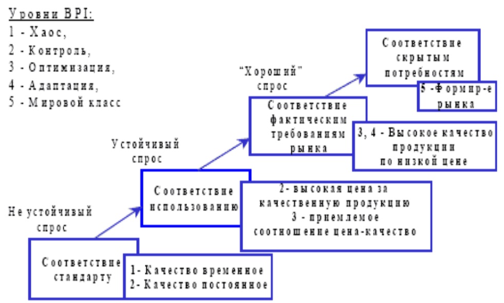 «Соответствие стандарту» подразумевает то качество продукции, которое достижимо на существующем технологическом оборудовании предприятия и соотносится с BPI-уровнями «Динамик-Хаос» и «Контроль». На предприятиях, организация бизнес- процессов которых соответствует BPI уровню «Хаос», качество продукции является случайной величиной и напрямую зависит от способностей отдельных сотрудников. Качество продукции для BPI уровня «Контроль» уже является постоянной величиной за счет того, что предприятие из «черного ящика» превращается в «прозрачную систему», где налажен четкий производственный и управленческий учет и контроль.
