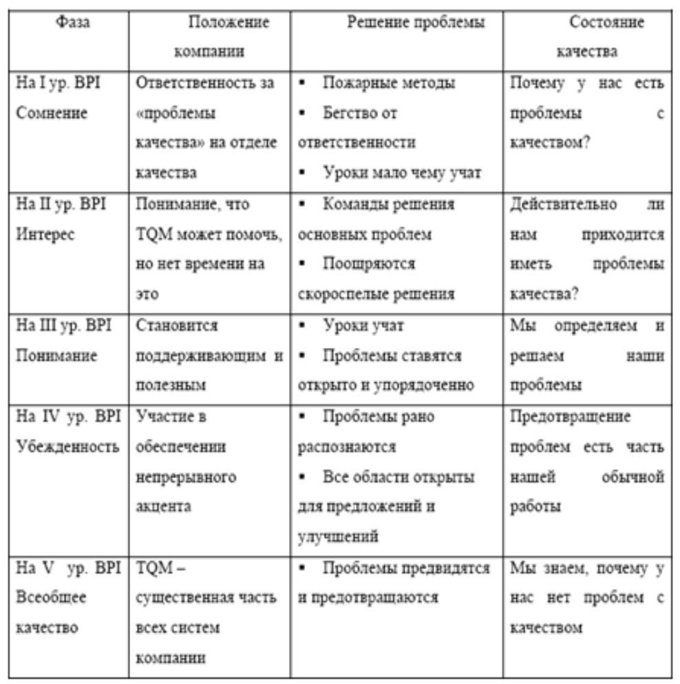 Определены следующие фазы развития качества, фиксирующие проникновение философии TQM на предприятие.