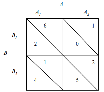 В клетках матрицы представлены все соответствующие издержки и вознаграждения, релевантные для данного взаимодействия. Читается матрица таким образом: если участник А избирает во взаимодействии линию поведения А1, а участник В – В1, то А получает, например, шесть единиц позитивного исхода, а В — две единицы, то есть в данном случае имеются позитивные исходы у обеих сторон.