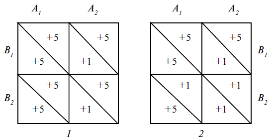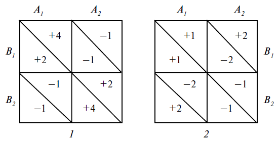 В первой матрице (рис. 3 (1)), если А выберет А1, то он тем самым весьма повлияет на исход для В — для него уже исключена возможность исхода +4, он может иметь либо +2, либо –1. В этом и состоит поведенческий контроль, а лучше сказать, влияние А на В. Аналогично и В может влиять на исходы для А: если В выбирает В2, то для А исключается исход +4 и он может получить либо +2, либо –1. Чтобы более конкретно представить себе данную ситуацию, обычно приведенная матрица получает следующую условную содержательную интерпретацию. Муж (А) и жена (В) хотели бы вместе провести вечер, причем муж предпочитает, чтобы они вместе пошли в кино (А1, В1) а жена – чтобы они вместе пошли на концерт (А2, В2). Пойти порознь для них хуже, чем идти на нежелаемое, но вдвоем. Если оба отправляются в кино, то для А это хорошо (+4): он любит кино, да к тому же они идут вместе. Для В это сулит меньший исход (+2): она не любит кино, но все-таки они идут туда вдвоем. Если А идет в кино, а В — на концерт, это испортит настроение обоим (А = –1, В = –1) – они не выносят разлуки. Если оба посещают концерт, это благоприятствует В (+4): она любит концерты, к тому же они будут вдвоем. Для А этот вариант несколько хуже (+2): ему не нравятся концерты, разве что они будут здесь оба. Если А — на концерте, а В — в кино, то они опять оказываются порознь, и это для них плохо (А = –1, В = —1).