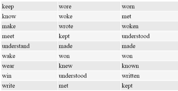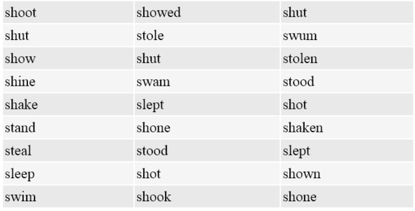 Майкл плавал; они построили; она научила; он украл; она подумала; мы взяли; вы нашли; он получил; я прочитал; мы положили; они продали; я ушел; ты поел; он побил; солнце поднялось; ты знал; луна светила; она закрыла; мы поговорили; ты дал; он вырос; они имели; вы ударили; он заморозил.