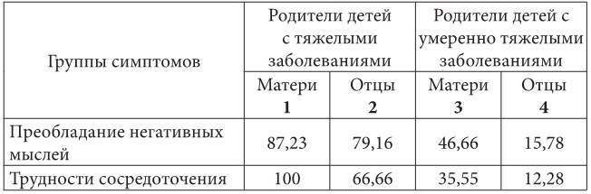 Обращают на себя внимание высокие показатели патологических симптомов в интеллектуальной сфере у родителей тяжелобольных детей, что выражается в трудностях сосредоточения, снижении качества памяти, невозможности принять решение. Таким образом, когнитивная сфера родителей тяжелобольных детей оказалась чувствительной к действию острого стрессора. Наибольшие изменения в поведенческой сфере касались снижения работоспособности, увеличения количества ошибок и хронической нехватке времени. Можно говорить о риске потери трудового потенциала родителей при сохранении подобного уровня симптомов в интеллектуальной и поведенческой сферах.