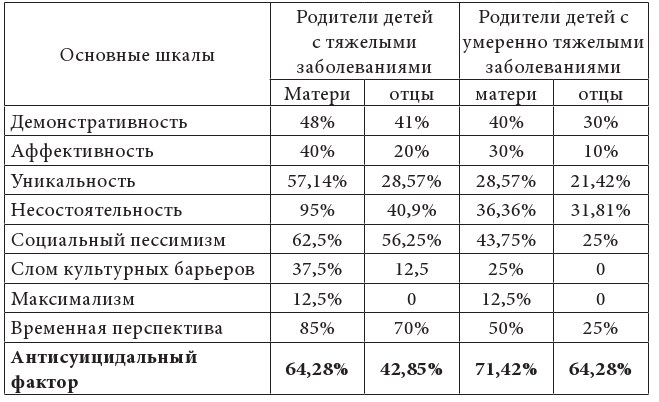 Одним из основных выводов на данном этапе исследования является утверждение о высокой суицидальной готовности в группе родителей тяжелобольных детей. Без специальной психолого-педагогической помощи, без изменений условий проживания первого этапа адаптации к болезни ребенка нельзя исключить реализации части суицидальных мыслей в данной группе.