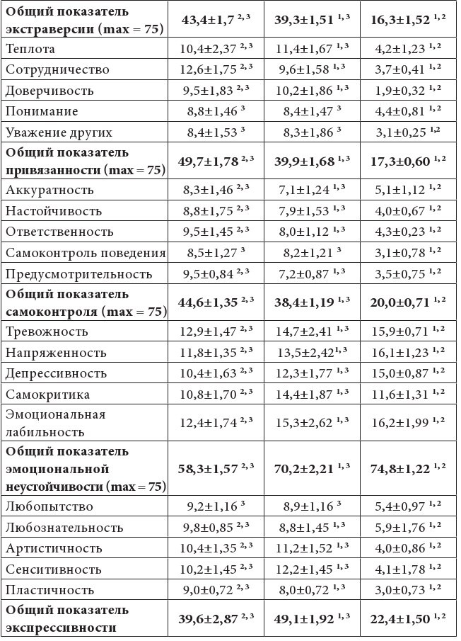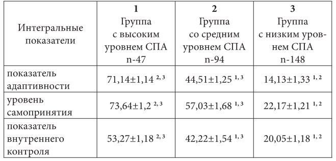 Примечание: 1, 2, 3 – статистически значимые различия (p < 0,01) по сравнению с группами с высоким, средним и низким уровнями СПА соответственно.