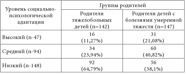 Можно сделать вывод, что тяжесть болезни ребенка в момент сообщения диагноза является значимым показателем социально-психологической адаптации родителей. Однако нас насторожил достаточно высокий процент респондентов с низким и средним уровнем адаптации в группе родителей, воспитывающих детей с заболеваниями умеренной тяжести.
