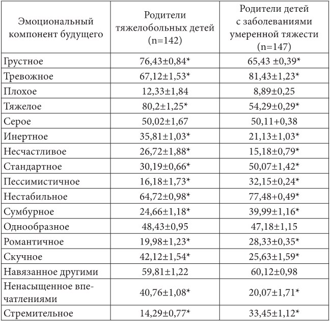 Представленные данные демонстрируют некоторые различия в эмоциональном отношении к своему будущему родителей двух групп. Значимые различия зафиксированы по нескольким параметрам. Родители тяжелобольных детей относятся к своему будущему в большей степени, как к тяжелому и грустному. В их субъективной жизненной перспективе меньше оптимизма, больше реалистичности.